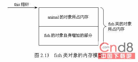 当我们构造fish类的对象时,首先要调用animal类的构造函数去构造animal类的对象,然后才调用fish类的构造函数完成自身部分的构造,从而拼接出一个完整的fish对象。当我们将fish类的对象转换为animal类型时,该对象就被认为是原对象整个内存模型的上半部分,也就是图2.13中的“animal的对象所占内存”。当我们利用类型转换后的对象指针去调用它的方法时,自然也就是调用它所在的内存中的方法。因此,出现如图2.12所示的结果,也就顺理成章了。