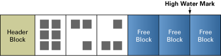 Oracle不会释放空间以供其他对象使用,有一条简单的理由:由于空间是为新插入的行保留的,并且要适应现有行的增长。被占用的最高空间称为最高使用标记(HWM),如图2所示: