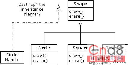 在这里,我们创建了Circle对象,并将结果句柄立即赋给一个Shape。这表面看起来似乎属于错误操作(将一种类型分配给另一个),但实际是完全可行的――因为按照继续关系,Circle属于Shape的一种。因此编译器认可上述语句,不会向我们提示一条出错消息。