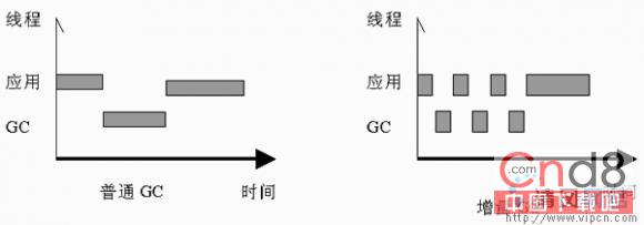 下图就表示了,增量式GC和普通GC的比较。其中灰色部分表示线程占用CPU的时间。