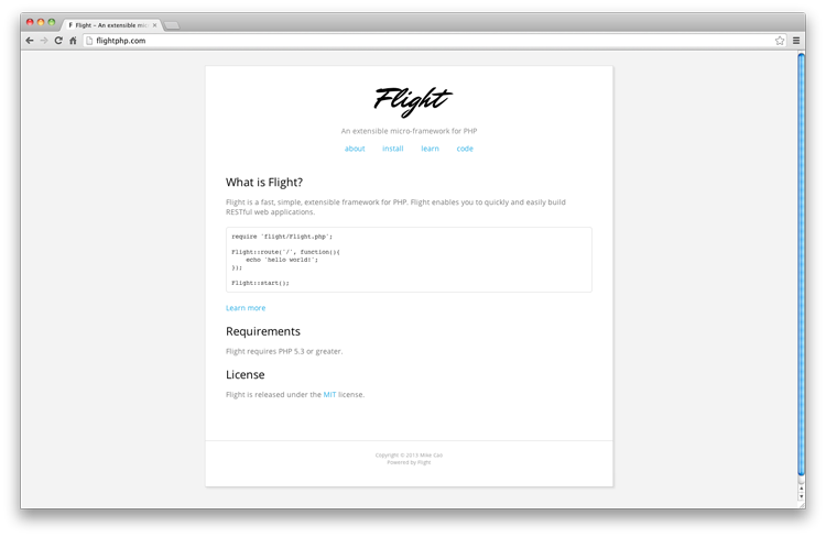Flight 是一个快速,简单,可扩展的微型 PHP 框架,允许用户快速的构建 RESTful web 应用,同样易于学习和使用,简单但是很强大!