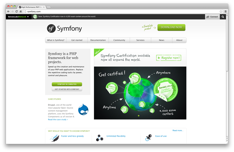 这个框架是在 2005 年创建,是个非常强大的 MVC 框架,在企业界是非常受欢迎的。Symfony 是收到众多的 web 应用框架启发的:Ruby on Rails,Django 和 Spring ,它可能是最完整的 PHP 框架了。