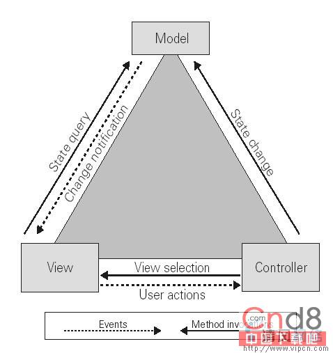 下图是典型的Model-View-Controller范式,经常被表示为:一个互相连接的三角形。