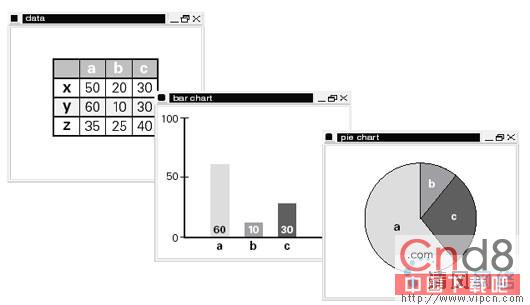 在Design Patterns: Elements of Reusable Object-Oriented Software一书中,作者以smalltalk MVC为例,赞扬了通知/订阅者(notify/subscribe)协议和观察者(Observer)模式的使用。其中局的一个经典的例子是对同一数据,系统可能需要不同的显示视图,比如条形图、饼图、数据表格等等,如下图:
