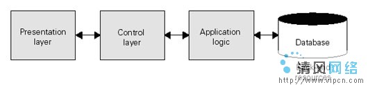 如图3,分层的web 应用使用一种比传统MVC模式更加“扁平”的模式。控制器被夹在表现层(View) 和 应用逻辑 (Model)之间。