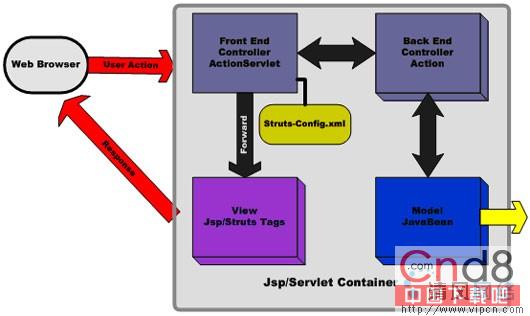 Action作为Back End Controller可以与Model部分交互,以实现状态改变或者状态查询,Action还将返回下一步的视图选择给ActionServlet。ActionServlet根据对应的Struts-Config.xml找到视图选择对应物理地址,并把新的View返回给用户端。