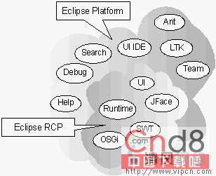 尽管Eclipse被认为是构建集成开发环境(IDE)的框架,从3.0开始,Eclipse整个产品进行了重构,分割成各种不同的部件,它些部件可以用于构建任意的应用程序。其中的一个子集构成了富客户平台,它包含以下元素:基本的运行时环境、用户界面组件(SWT和JFace)、插件以及 OSGI层。图1显示了Eclipse平台的主要部件。