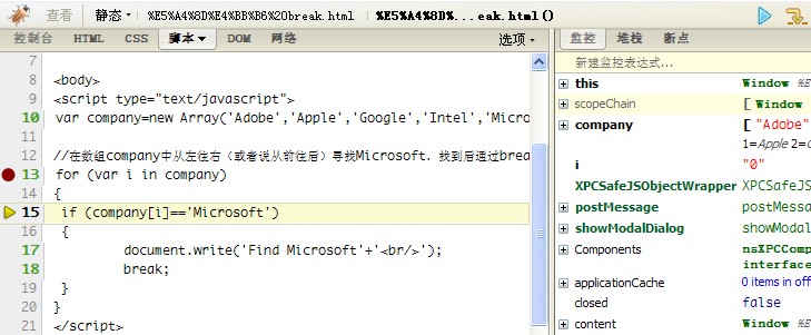 通过脚本调试工具(比如Firefox浏览器的Firebug插件)单步调试可以发现,使用了break语句,循环了五次便退出了循环。而没有使用break语句的话,循环要遍历完整个数组。