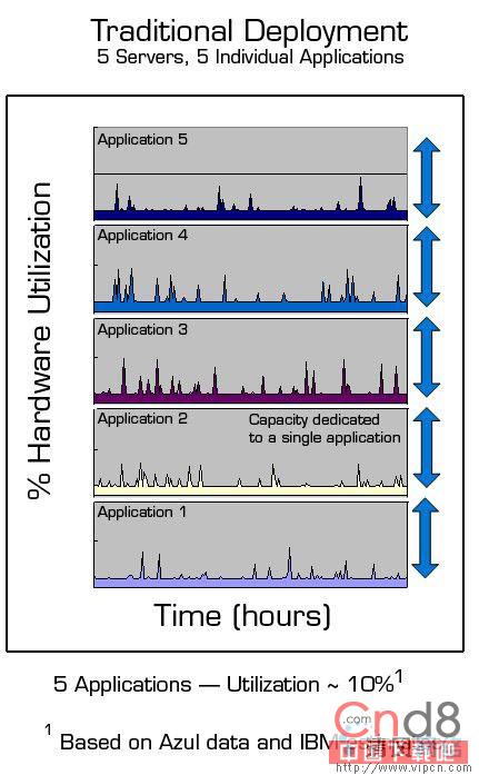 因为较低运算能力的独立服务系统难以满足一个典型企业应用的要求,服务主机一般不横跨共享多个应用;一个应用会占用一个或更多的服务器,而这些服务器并非互不相关的。这种方法让很多企业开支可观,因为那些每个应用所分配的资源是按照应用的最高负荷来规划的(乘上安全边界需求),即使一般的需求远远低于最高负荷。假如一个企业拥有多个应用,而这些应用的负荷峰值的期间并无关系―这正是大数企业的状况,结果就是应用间的容量(参与成本,attendant cost)大量被浪费了。它的效用经常看起来像下表所列:
