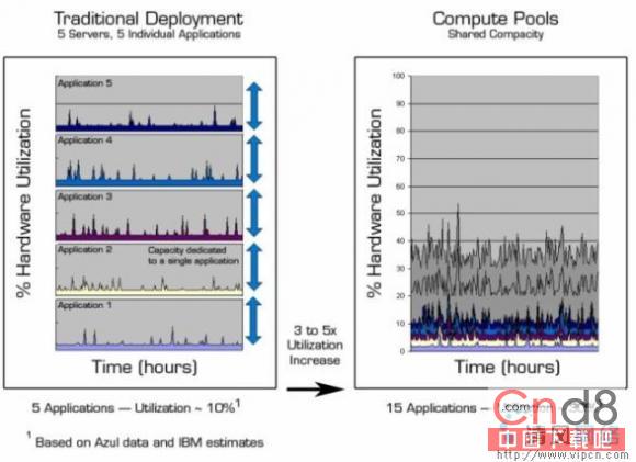 因为应用载入时间的高峰随着应用的不同而不同(比如发薪水的应用在月初最高,发劳保金的应用在开放注册时最高,等等),治理企业基础上的容量可以获得更大的硬件利用效率,因为你再也不需要在应用的最大值时购买或供给额外的容量给服务应用――除了在所有应用的载入最大值的时候,而这时的值也比独立应用的峰值之和要小得多。(将应用层的处理整合进计算池,也简化了治理使用与规划容量的过程)。