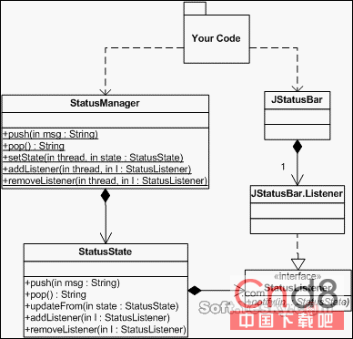 由于我不希望直接在业务逻辑中引用任何GUI组件,我将建立一个StatusManager(状态管理器)来充当状态更新的入口点。实际的通知会被委托给StatusState对象,因此以后可以扩展它以支持多个并发的线程。图2显示了这种安排。