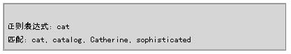 我们先从简单的开始。假设你要搜索一个包含字符“cat”的字符串,搜索用的正则表达式就是“cat”。如果搜索对大小写不敏感,单词“catalog”、“Catherine”、“sophisticated”都可以匹配。也就是说: