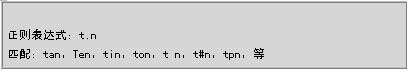假设你在玩英文拼字游戏,想要找出三个字母的单词,而且这些单词必须以“t”字母开头,以“n”字母结束。另外,假设有一本英文字典,你可以用正则表达式搜索它的全部内容。要构造出这个正则表达式,你可以使用一个通配符――句点符号“.”。这样,完整的表达式就是“t.n”,它匹配“tan”、“ten”、“tin”和“ton”,还匹配“t#n”、“tpn”甚至“t n”,还有其他许多无意义的组合。这是因为句点符号匹配所有字符,包括空格、Tab字符甚至换行符: