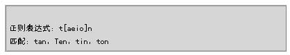 为了解决句点符号匹配范围过于广泛这一问题,你可以在方括号(“[]”)里面指定看来有意义的字符。此时,只有方括号里面指定的字符才参与匹配。也就是说,正则表达式“t[aeio]n”只匹配“tan”、“Ten”、“tin”和“ton”。但“Toon”不匹配,因为在方括号之内你只能匹配单个字符: