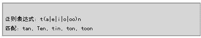 如果除了上面匹配的所有单词之外,你还想要匹配“toon”,那么,你可以使用“|”操作符。“|”操作符的基本意义就是“或”运算。要匹配“toon”,使用“t(a|e|i|o|oo)n”正则表达式。这里不能使用方扩号,因为方括号只允许匹配单个字符;这里必须使用圆括号“()”。圆括号还可以用来分组,具体请参见后面介绍。