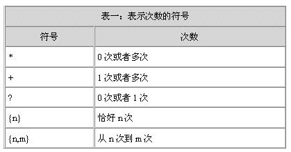 表一显示了表示匹配次数的符号,这些符号用来确定紧靠该符号左边的符号出现的次数: