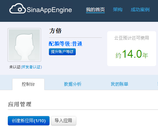 申请地址:http://sae.sina.com.cn/ ,使用新浪微博账号可以直接登录SAE,登录后SAE将赠送500个免费云豆。