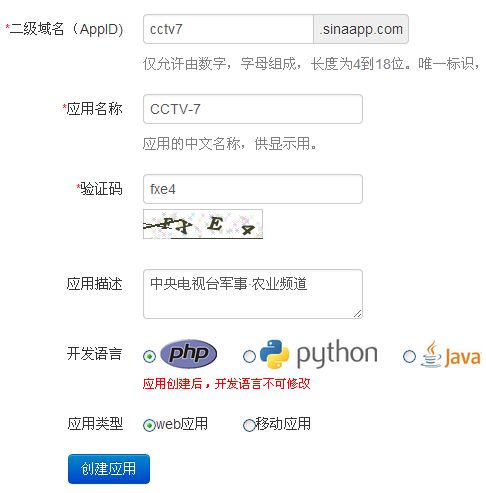 填写二级域名AppID、应用名称、验证码,开发语言选择PHP,应用类型选择web应用。然后点击创建应用