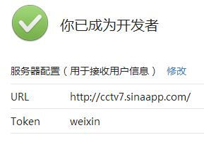 此处的URL为上篇中介绍的云应用的域名,而Token在index.php中定义为weixin。提交后提示你已成为开发者。