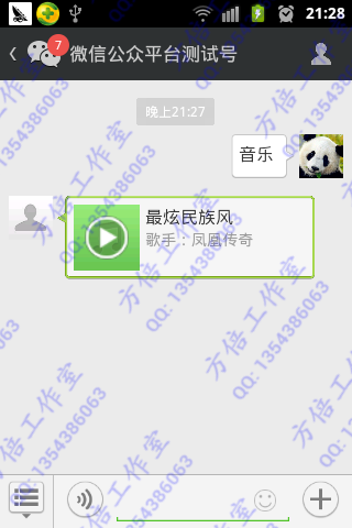 只介绍三种格式的消息:文本、图文、音乐。其中图文消息包括单条图文消息和多条图文消息,展示方式有一点点不同。