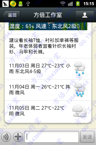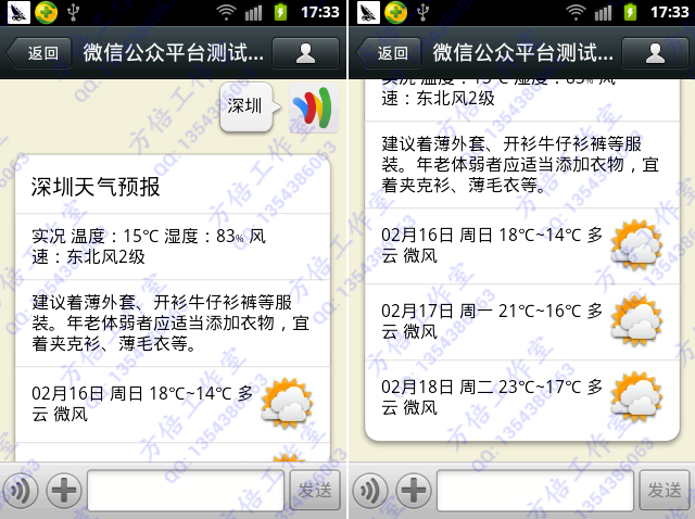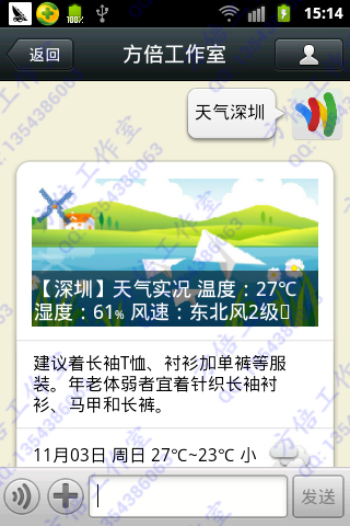 1.发送城市名称,如“深圳”,可以查询该城市的天气