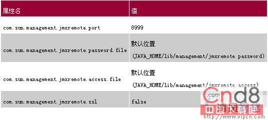 只有对一些系统属性进行设置后才能使用JMX远程监测,这些属性由一个在JAVA_HOME/lib/management目录下名为management.properties的属性文件设定。表2给出了启用JXM监测所必须设定的属性。