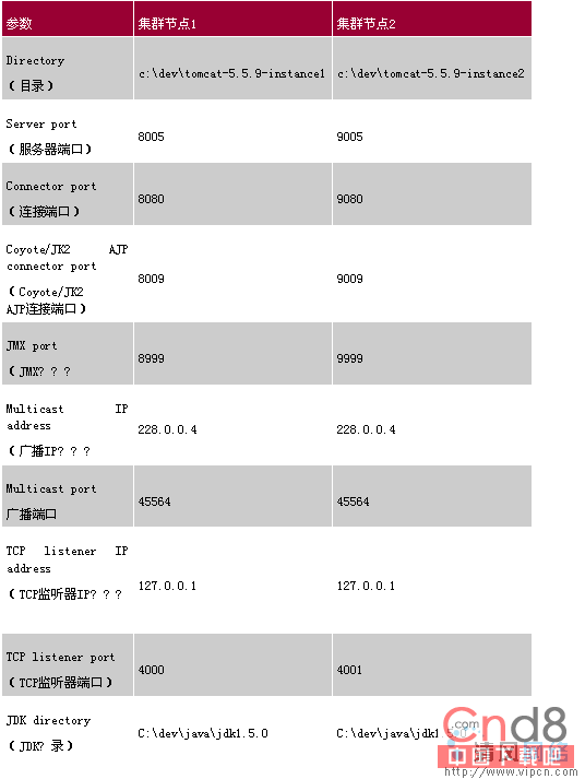 表3列出了组建Tomcat集群所需的各项配置参数。