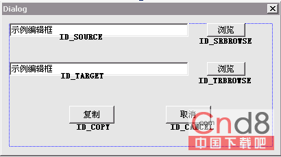 BOOL CDialogDlg::OnInitDialog(){ CDialog::OnInitDialog(); //执行父类默认的初始化对话框操作 // IDM_ABOUTBOX 必须在系统命令范围内。 ASSERT((IDM_ABOUTBOX & 0xFFF0) == IDM_ABOUTBOX); ASSERT(IDM_ABOUTBOX < 0xF000); // 将“关于...”菜单项添加到系统菜单中。 CMenu* pSysMenu = GetSystemMenu(FALSE); //取得此对话框系统菜单的CMenu对象指针,并赋给pSysMenu; if (pSysMenu != NULL) //如果不为空,则 { CString strAboutMenu; //声明一个字符串对象 strAboutMenu.LoadString(IDS_ABOUTBOX); //取得资源IDS_ABOUTBOX预定义字符串,可以 //在资源视图中的String Table查到和设定这个预定义字符串 if (!strAboutMenu.IsEmpty()) //如果不为空,则 { pSysMenu->AppendMenu(MF_SEPARATOR); //向菜单添加一个分隔符 pSysMenu->AppendMenu(MF_STRING, IDM_ABOUTBOX, strAboutMenu); //向菜单添加这个字符串,并将消息ID设为IDM_ABOUTBOX } } // 设置此对话框的图标。当应用程序主窗口不是对话框时,框架将自动 // 执行此操作 SetIcon(m_hIcon, TRUE); // 设置大图标 SetIcon(m_hIcon, FALSE); // 设置小图标 // TODO:在此添加额外的初始化代码 return TRUE; // 除非设置了控件的焦点,否则应该返回 TRUE}以上,就是这个基于对话框的MFC应用程序的基础代码。现在可以直接编译运行,来查看效果。 下面,我将在这些代码的基础上来添加功能,来实现一个复制文件的程序。 首先,我要在资源视图的Dialog中,修改IDD_DIALOG_DIALOG模板: 我首先将对话框模板上面的所有按钮和静态文本全部删掉,添加两个文本框和四个按钮。如果要修改控件的ID值,则要右击控件,点选属性,在ID框中输入任意的ID字符串即可。基本布局如下: