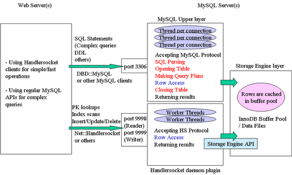 去年在twitter上看到HandlerSocket的出现,并宣称性能是Memcached的两倍时,非常令人吃惊,居然可以达到750000qps。接着HandlerSocket成为NoSQL领域谈论的焦点之一,大量的人开始想要尝试,并做过一些自己的性能测试。下图是HandlerSocket的结构图: