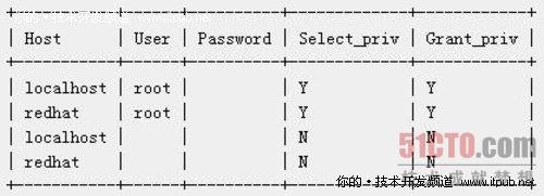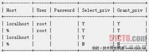 mysql> select Host,User,Password,Select_priv,Grant_priv from user;