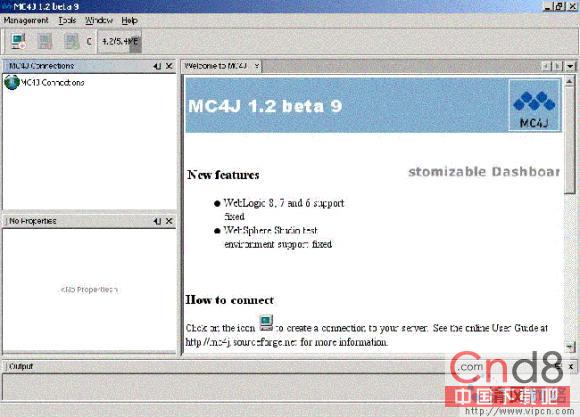 3.双击可执行文件(C:dev oolsmc4jMC4J Console 1.2b9.exe)启动MC4J(注:在这个应用示例中,我在同一台机器上运行JMX客户端和Tomcat集群,但在真实的场景中,JMX客户端是在远程机上运行,而不是在应用服务器上),启动后MC4J的控制台应该如图2所示: