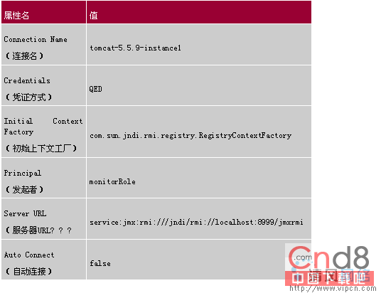 控制台启动后,创建一个新的连接绑定到JMX服务器上。用Management菜单的Create Server Connection选项新建一个连接,命名为Tomcat-5.5.9-instance1,该连接的设置如表4所示: