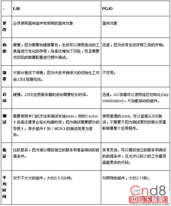 上述方法在开发时具有几个优点。下表对EJB和基于POJO的组件开发进行了比较。如您所见,POJO使测试更为轻松,本例中EJB的整个更改/构建/部署/测试/验证周期大约是POJO的5~10倍,而且POJO的开发流程更具动态性。