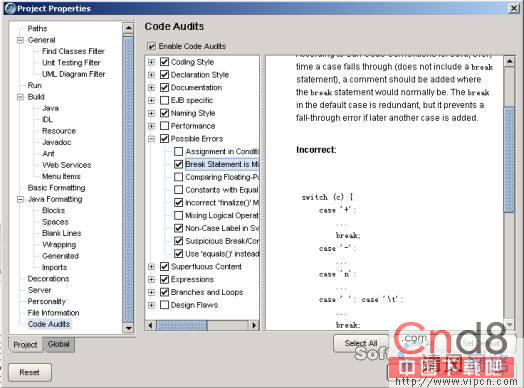 在默认情况下,JBuilde 2005未激活代码审查的功能,可以通过Project->Project Properties...->Code Audits调用代码审查的设置页。