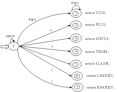 一般有两种方法来进行词法分析,一种是用状态图来实现,一种是用状态转换表。下面采用状态图实现