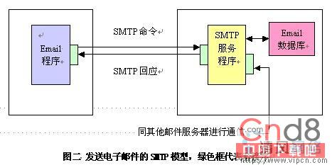让我们假设所有的操作都成功了,那么电子邮件程序将把邮件发送到SMTP服务程序,假如电子邮件的接收地址正好是该SMTP服务程序运行的服务器,那么SMTP服务程序就会将邮件加入邮件数据库中,否则SMTP服务程序将把邮件转发到在其他SMTP服务器上的SMTP服务程序,直到到达目的地为止。图二通过图示说明了这一点。
