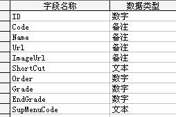 表字段依次为:自动编号、菜单编码、菜单名称、请求地址、菜单上显示的图片地址、快捷键(RadMenu控件支持)、菜单顺序、菜单级限、是否为末级和父菜单编码。 整个设计中主要以菜单编码作为关联依据。