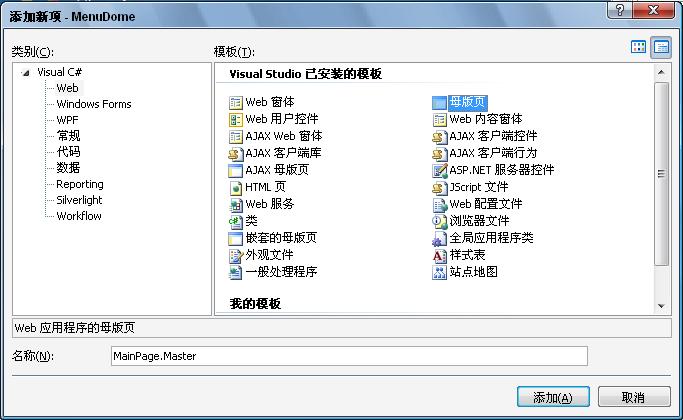 菜单一般都是公用的(不考虑用户权限相关的控制),我们可以把它开发成为一个公共的部分。本示例使用母版页来做菜单,新建母版页: