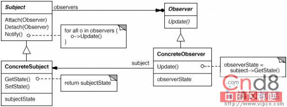 Object:观察者的抽象接口,Update方法是当得到Subject状态变化的通知后所要采取的动作;