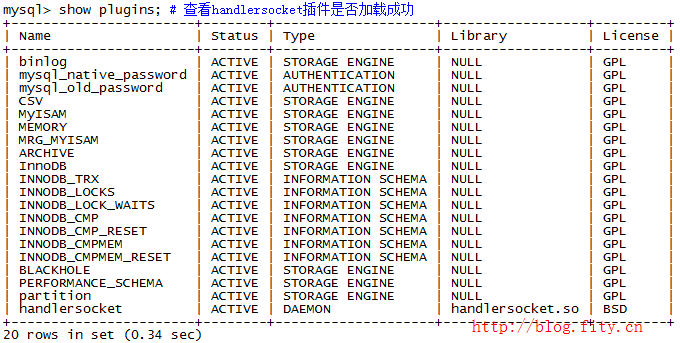 登陆MySQL并激活HandlerSocket插件: