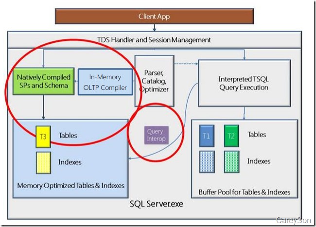 在SQL Server的Hekaton引擎由两部分组成:内存优化表和本地编译存储过程。虽然Hekaton集成进了关系数据库引擎,但访问他们的方法对于客户端是透明的,这也意味着从客户端应用程序的角度来看,并不会知道Hekaton引擎的存在。如图1所示。