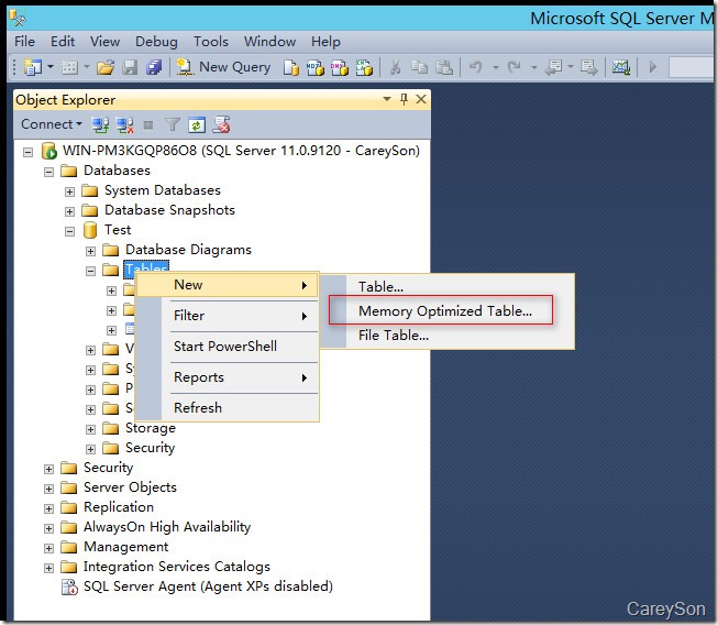 目前SSMS还不支持UI界面创建内存优化表,因此只能通过T-SQL来创建内存优化表,如图5所示。