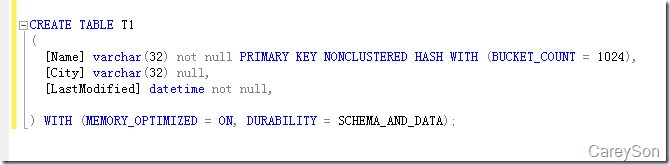 此外,由创建表的语句可以看出,目前SQL Server 2014内存优化表的Hash Index只支持固定的Bucket大小,不支持动态分配Bucket大小,因此这里需要注意。