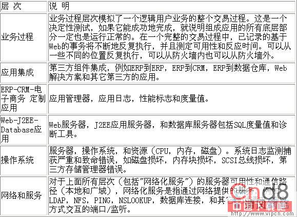 表1:应用栈。由于业务流程必然要使用栈中的各个层次,所以业务流程层次准确地反映了应用的业务流程可用性。