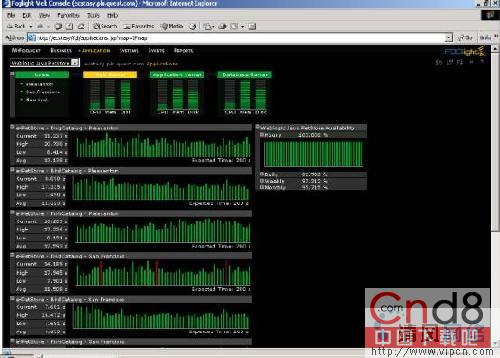 可以从业务页面直接导航到应用页面。如下面的图3所示,应用页面显示了应用基础架构的一个全貌,包括从整体的系统性能信息到具体的业务过程反应时间信息。该页面可以让用户导航到当前的或以前的系统信息和运行在每一层上的组件的应用性能信息,包括一些系统和应用阈值。