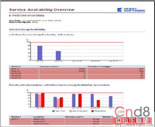 图4:这个应用服务报告按照服务组和服务组中每个地点显示了服务等级的测量信息。这个报告也提供了与具体的IT资源的关联信息。