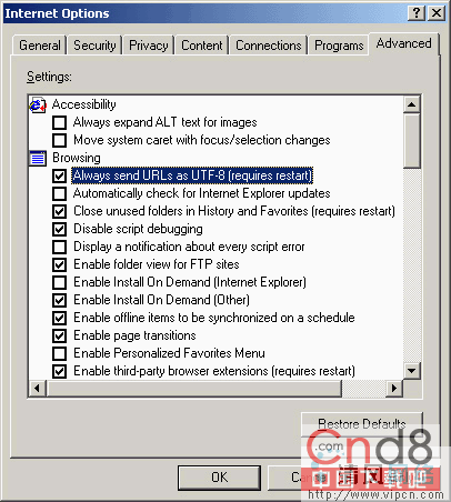 IE还有一个高级选项设置,可以强制浏览器总是以UTF-8编码方式发送URL请求,如图11所示。