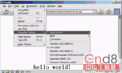 假如在Java、JSP或HTML源文件中有多字节文字字符串,就需要用支持它们的IDE。我用的是NetBeans,只要将文本编码属性设置为UTF-16就能轻松支持UTF-16编码。图12所示的是一个用UTF-16编码的JSP页面,它里面只有一个静态文字字符串“hello world!”。该页面在Tomcat上运行,在Mozilla中显示。