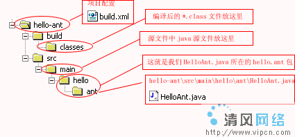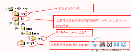 下图为文件组织,请建立相应的目录,并编写HelloAnt.java