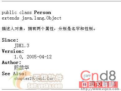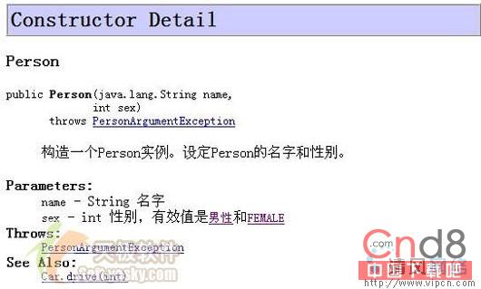 请看第3行的@see标签,因为Car和Person类不在同一个包中,所以必须指定类的全名,当然,假如Person.java已经通过import chapter19.tool.Car;引入Car类,则@see可以直接用使用不带包的类名:@see Car。所以Javadoc中的@see引用注释和在Java代码中引用类是相似的。